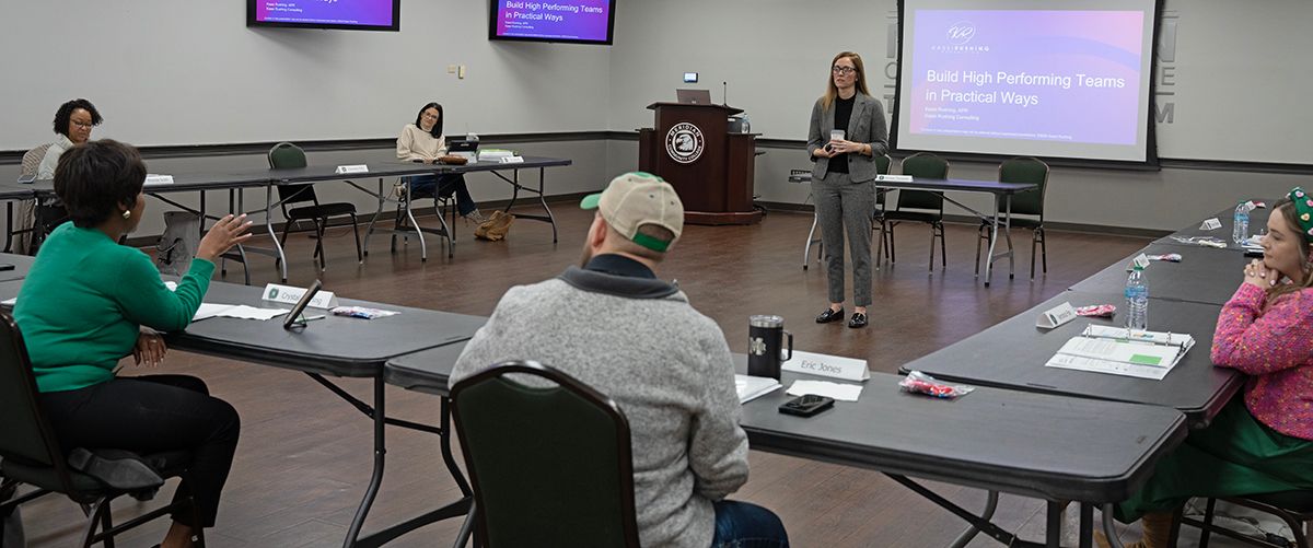 Dr. Leia Hill, vice president for institutional advancement and operations and executive director of the MCC Foundation, welcomed Rushing back and emphasized the value of the session. “This is one of the most practical sessions you can walk away from and use immediately,” Dr. Hill said. “It’s about building your team, creating trust, and learning how to lead in ways that really matter.”